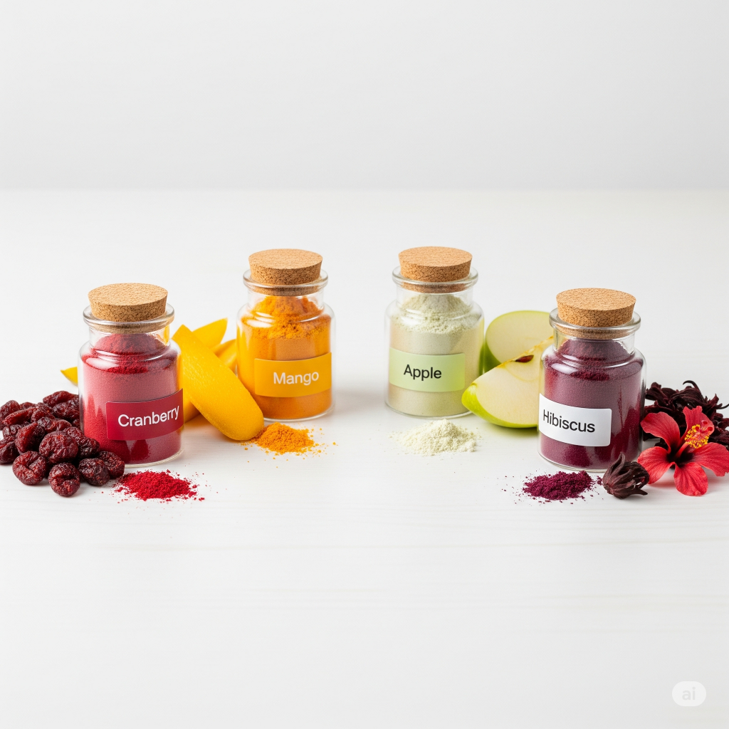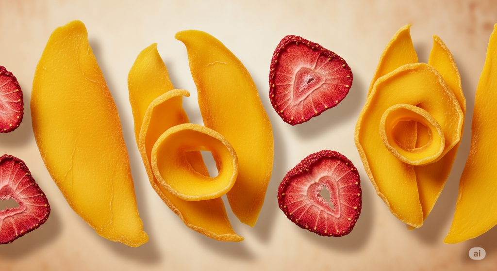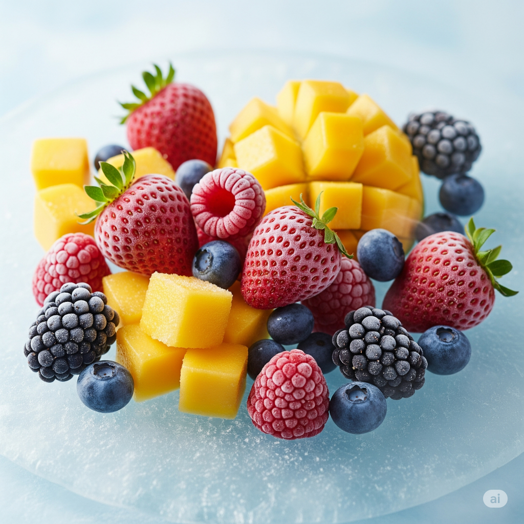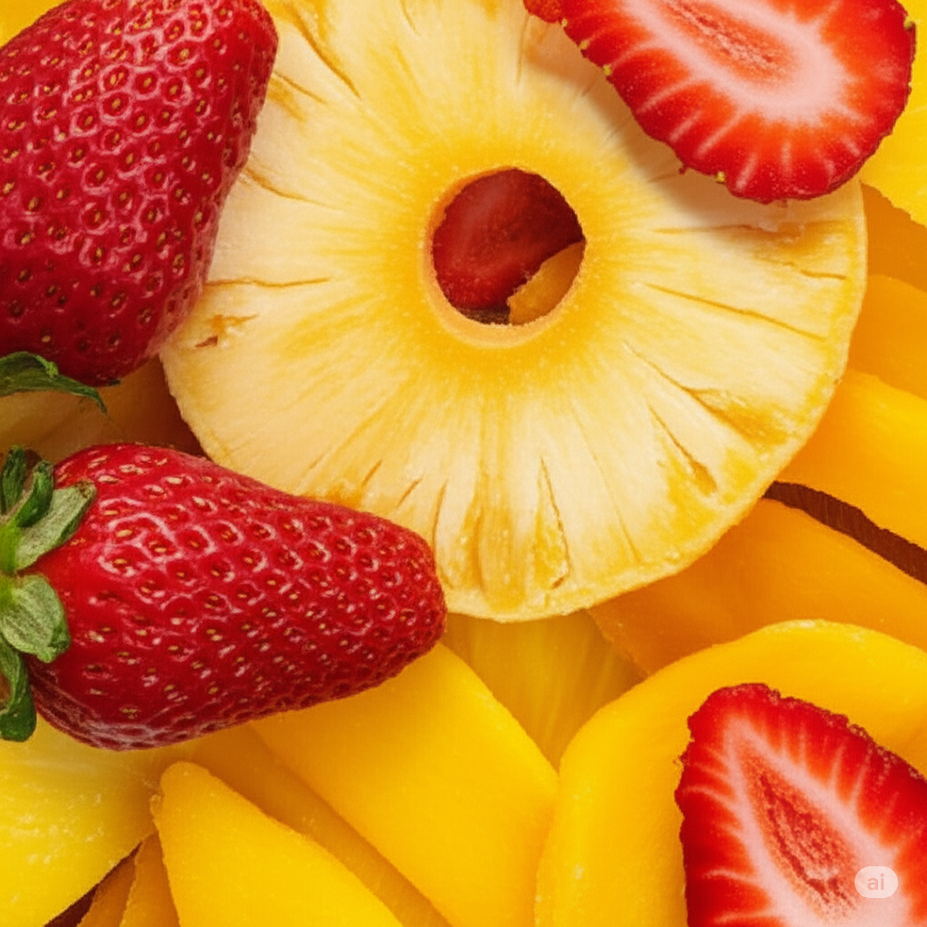 Fruta deshidratada, fruta congelada e ingredientes seleccionados.